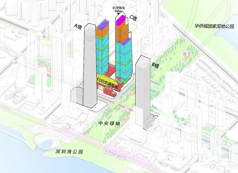 項目定位為集辦公、商業、文化、酒店、公共服務、交通市政等功能于一體的企業總部、國際組織和機構服務平臺,是片區“深灣都市核心”3個超高層地標之一,未來將與A塔、B塔共同構建深超總天際線形象,成為片區TOD地標。