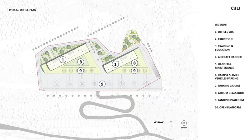 QIU受邀設(shè)計的深圳首個載人無人機(jī)港,將在未來成為大灣區(qū)低空商務(wù)旅行的新總部,兼?zhèn)渚仍行募拔磥黼妱哟怪逼鸾担╡VTOL)測試基地。